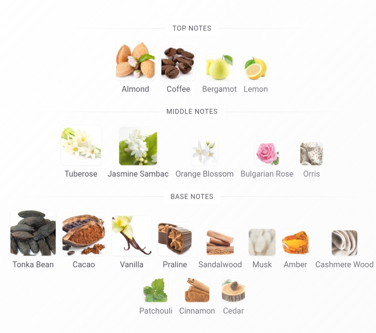 • Base notes:Tonka Bean, Cacao, Vanilla, Praline, Sandalwood, Musk, Amber, Cashmere Wood, Patchouli, Cinnamon and Cedar